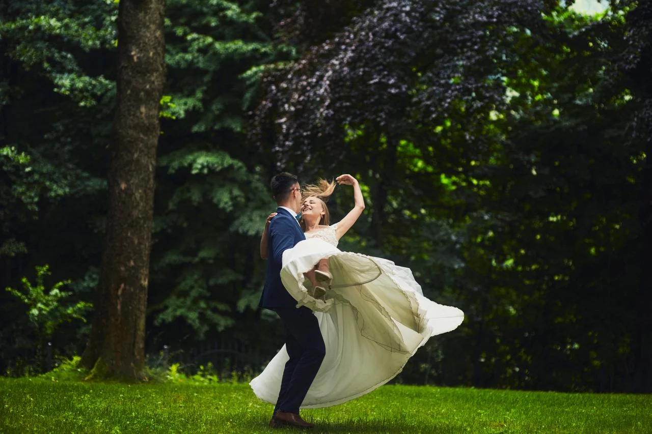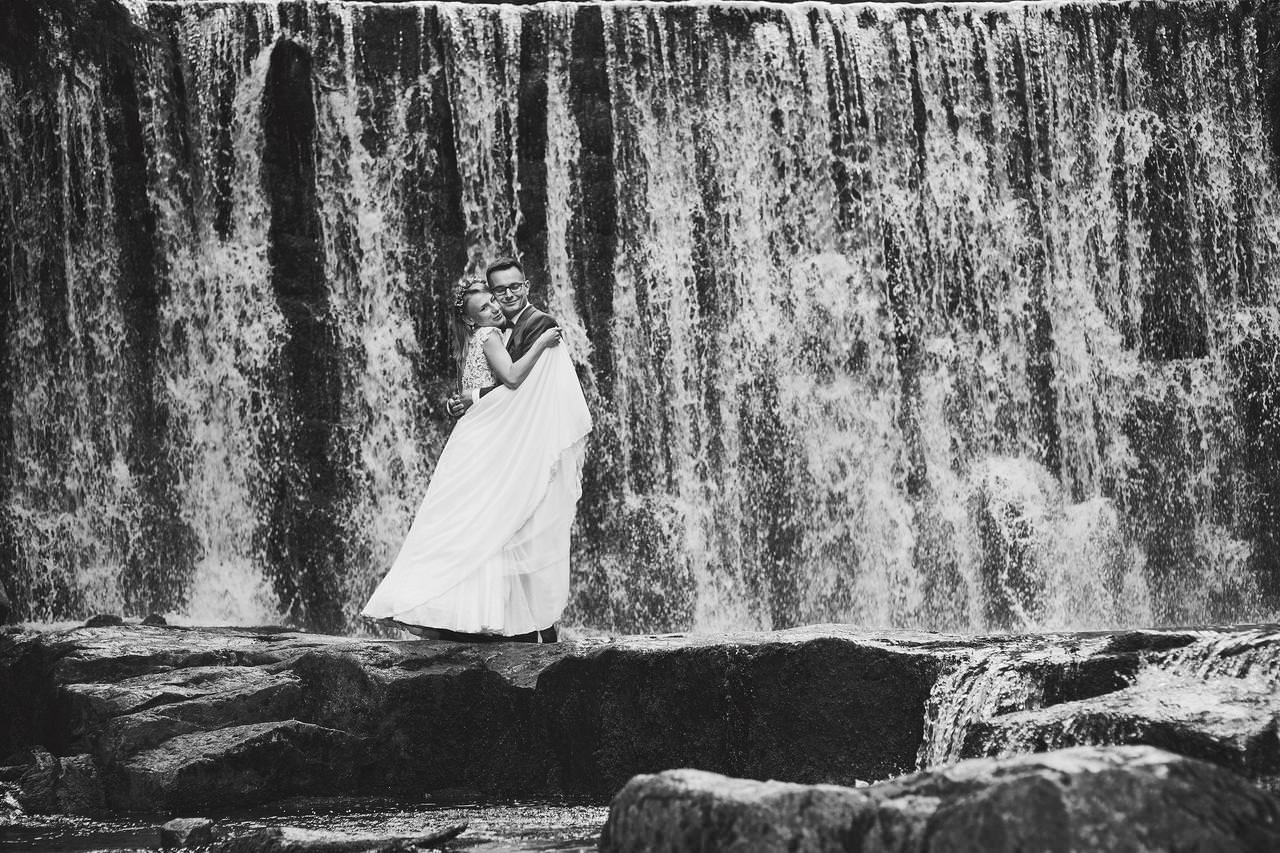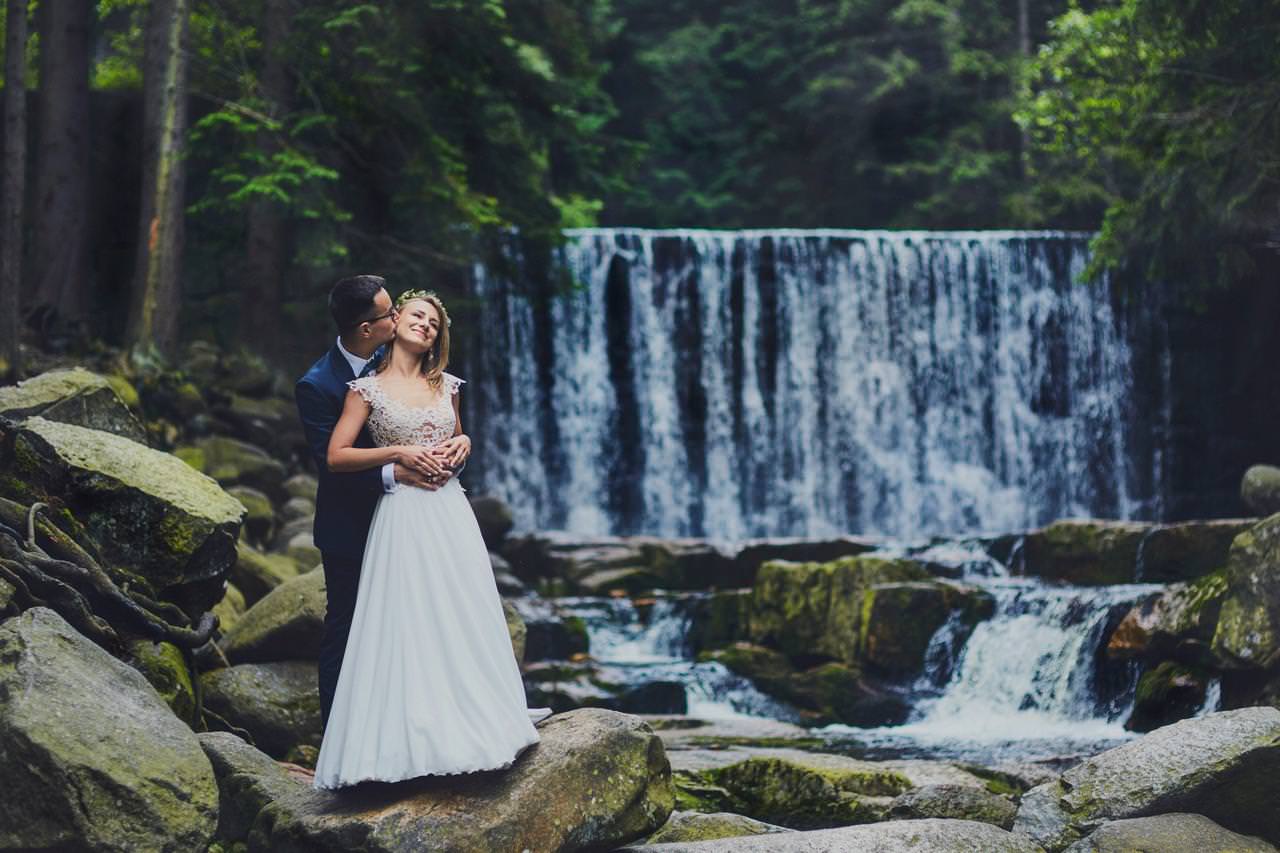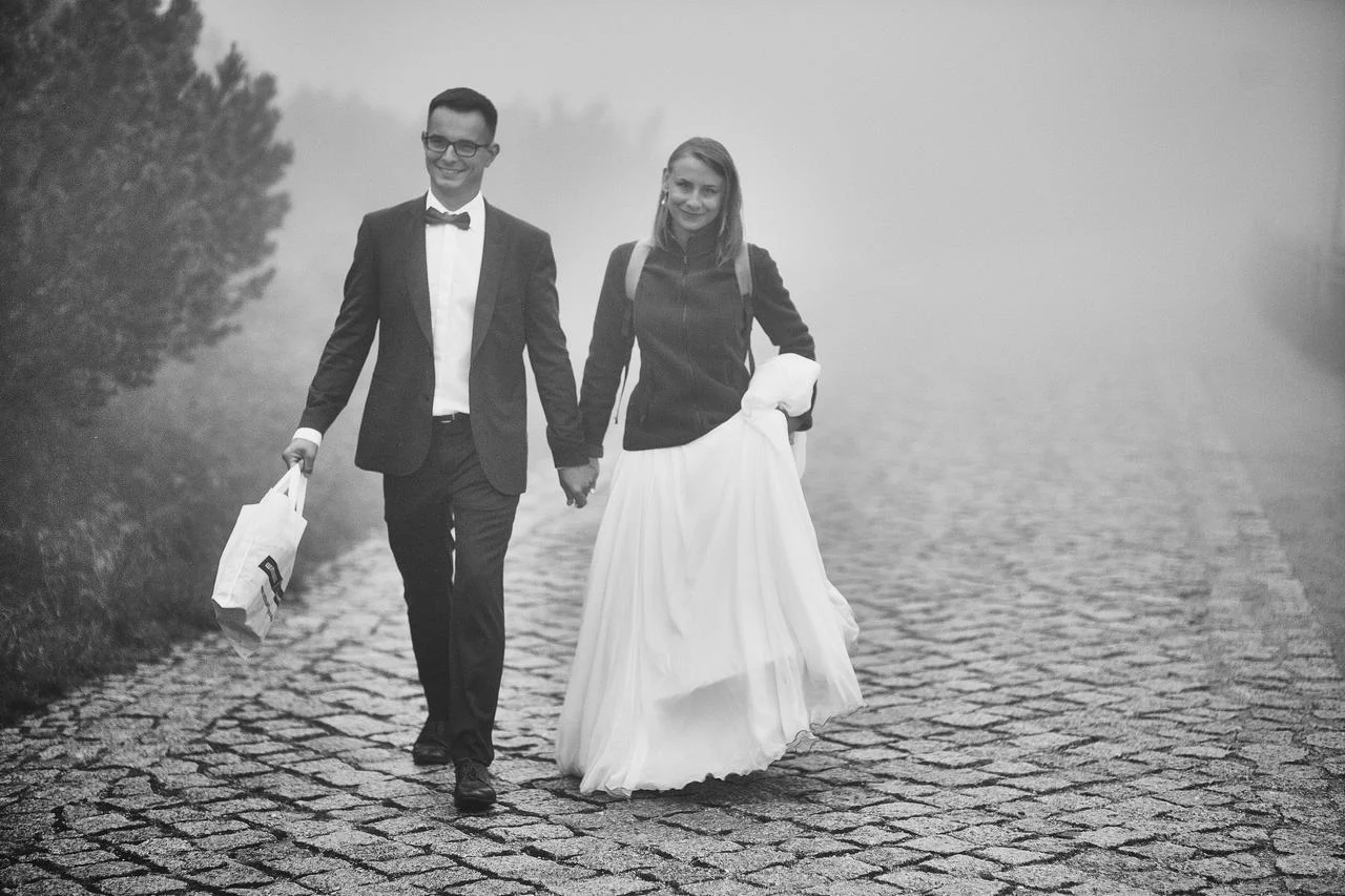 Praktycznie z każdą parą z jaką współpracowałem mam jakieś wspomnienia, każda sesja wiąże się z jakąś reminiscencją. Plener Pauliny i Marcina zapamiętałem w sposób szczególny. Gdy zaproponowali, by zrobić sesję w górach od razu się zapaliłem do pomysłu. Pod koniec czerwca, a więc tuż przed sezonem wakacyjnym, zjawiliśmy się w Karpaczu i mieliśmy ambitny plan zrobienia części zdjęć u podnóża “Śnieżki”. Jakież było nasze zdziwienie gdy po wyjściu z kolejki okazało się, że… widoczność jest na kilkanaście metrów… Gęsta mgła, przenikliwe zimno, ogromna wilgotność – szybko dały nam w kość i sprawiły, zjechaliśmy na dół i szukaliśmy innych możliwości. Znaleźliśmy…