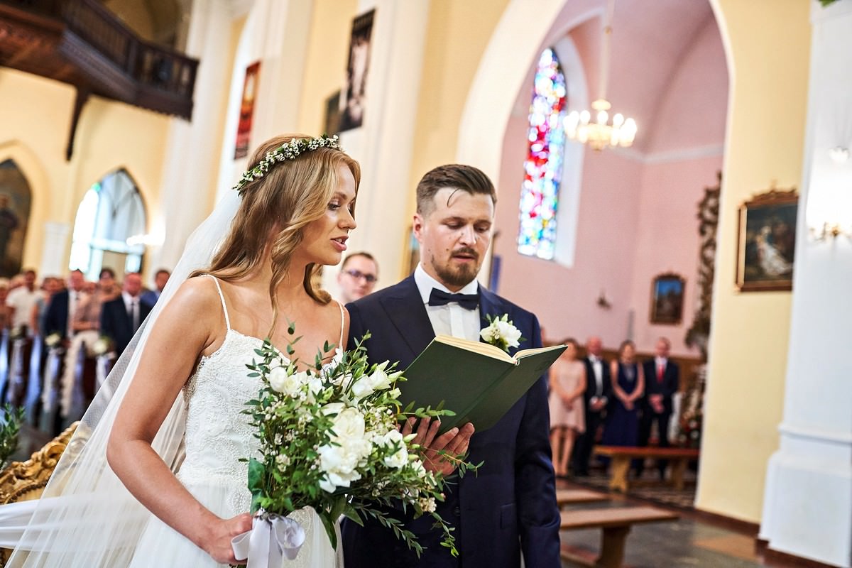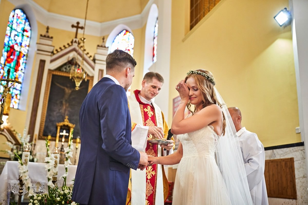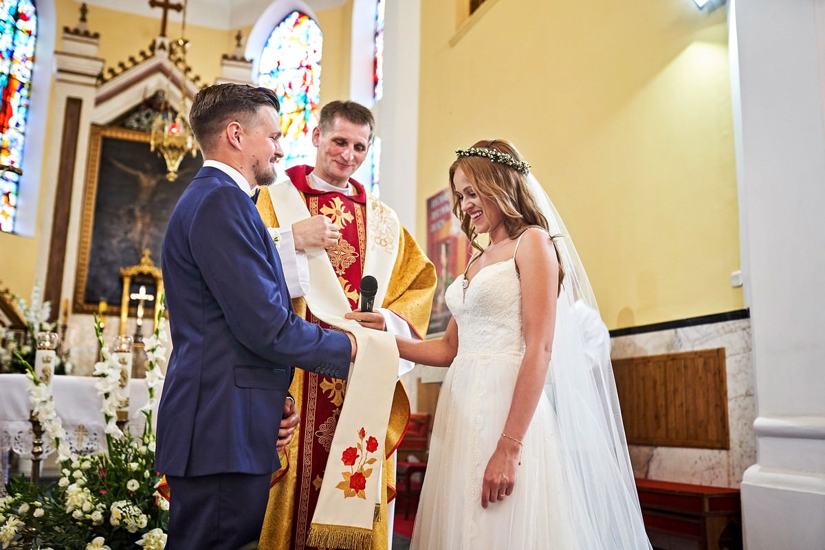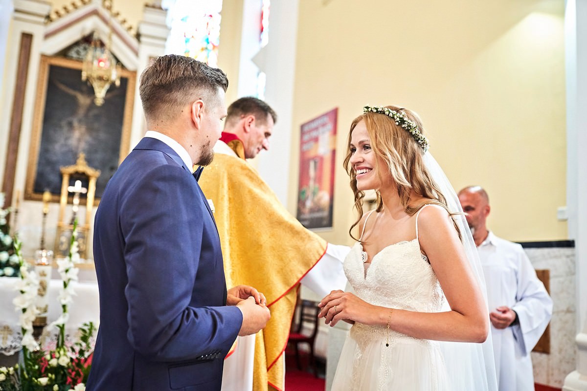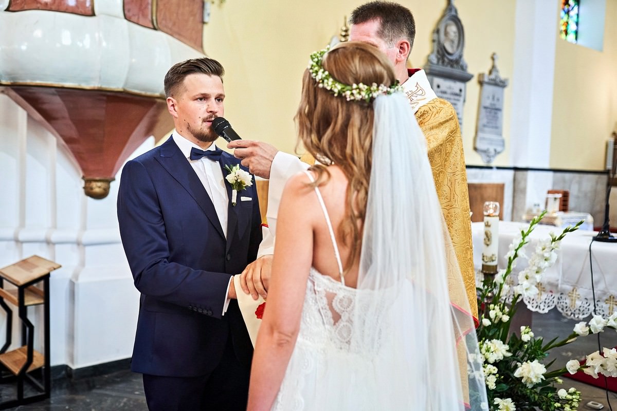 Ania była przepiękna w swojej białej sukni, a Tomasz dumnie stał u jej boku, uśmiechając się do niej z miłością i czułością. Ich słowa „TAK” brzmiały gorąco i szczere, jakby były wypowiadane dla samego siebie, a nie dla całego świata.