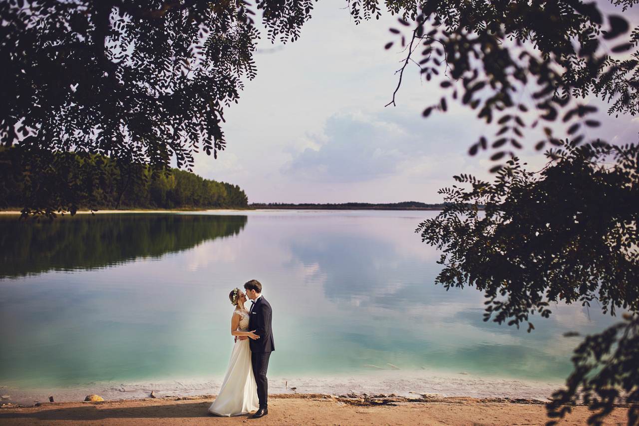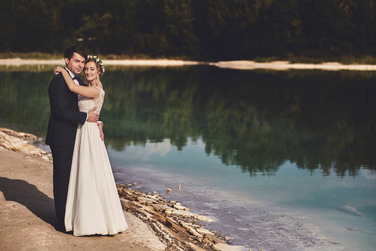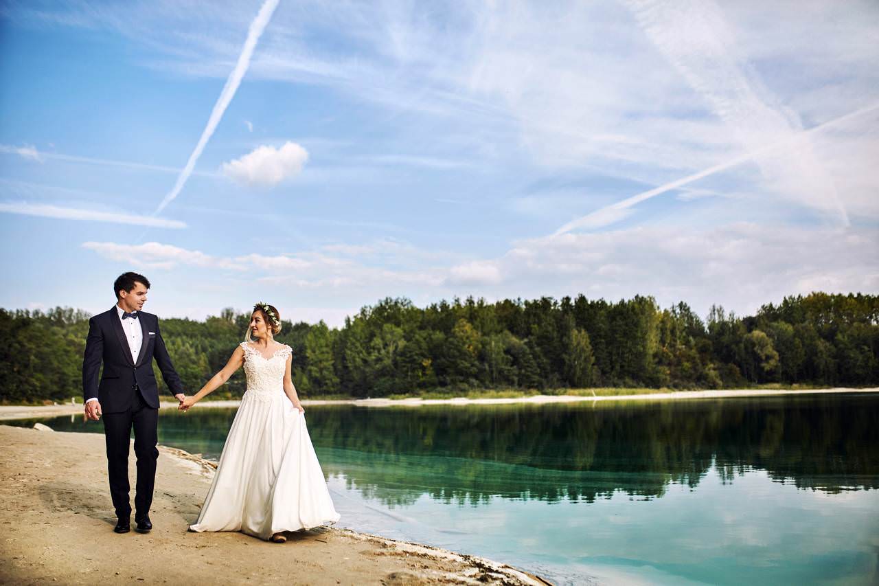 Na sesję plenerową z Martyną i Darkiem wybraliśmy się nad „polskie Malediwy”. czyli niezwykle malownicze lazurowe jeziorko, które swój niespotykany kolor zawdzięcza… popiołom i żużlowi z pobliskiej elektrowni…
